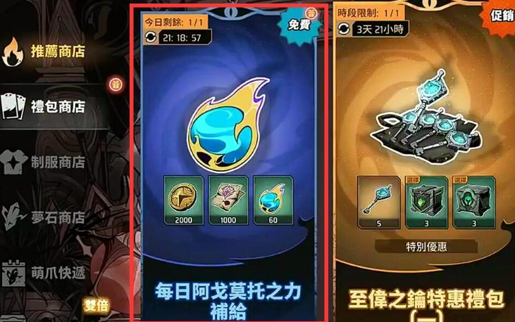 先来说一下,关键就是阿戈摩托之力,这就是大淘金之战的主要体力,每次挑战大概会消耗30个。不要担心不够使用,获取还是比较简单的。首先商店每一天都会有免费的补给,可以直接拿到60个。其次也可以用来去兑换,还可以用梦之金来换。三个梦之金就可以拿到60个,每天还可以更换8次,加上任务所给的奖励,那基本上每天起码可以打5次,所以完全足够大家去刷资源。这里也有一个小技巧,免费领取的是不可以储存的,放着不用就可能会浪费。