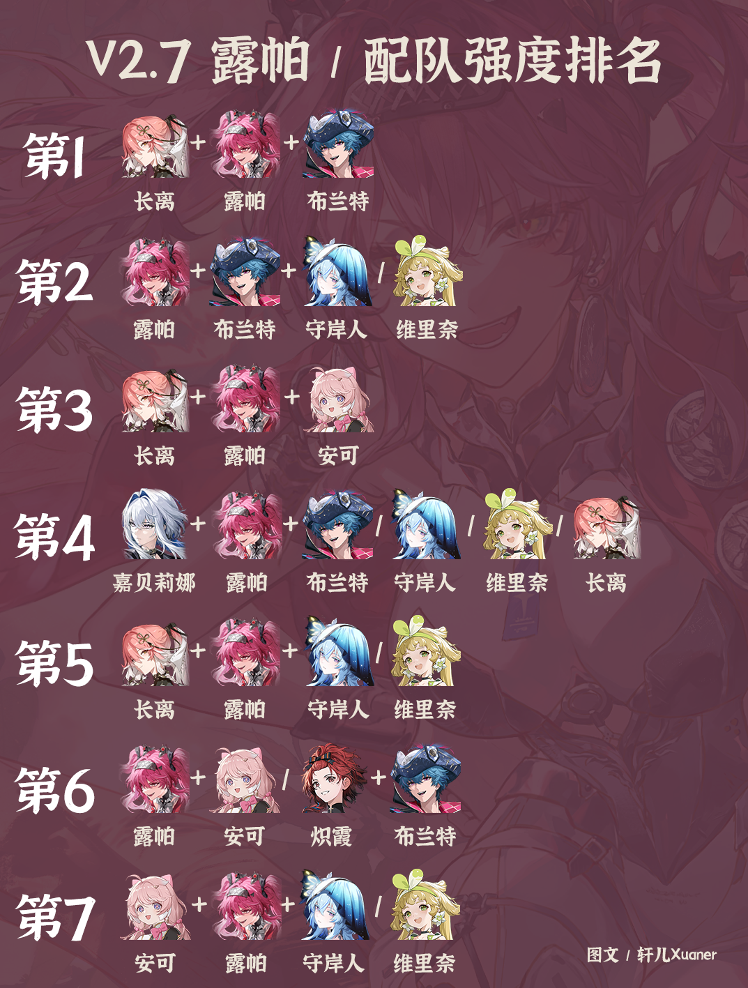 鸣潮2.7版本露帕全配队强度排名一览,长离+露帕+布兰特:老的三火队依旧是露帕的最佳配队,在于三者之间buff可以完美衔接适配。但三火队需要很好的速切手法,只是常规的切人伤害会差一些。