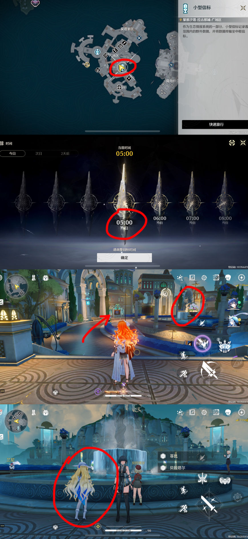 调整时间至:次日早上5:00,小地图-北方向,沿着面前的小路走到右边的喷泉面前就能看到菲比,与之对话即可获得此成就。