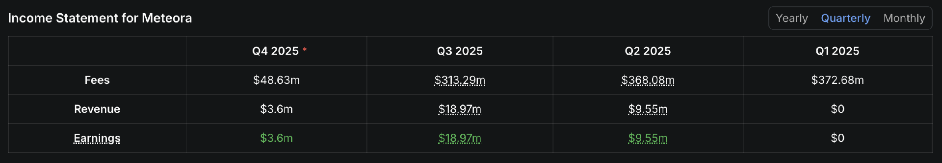 作为 Solana 生态整个 DeFi 世界营收能力最强的协议之一(DeFillama 数据显示,年内盈利已超 3200 万美元),市场对于 Meteora 也给予了相对乐观的估值。