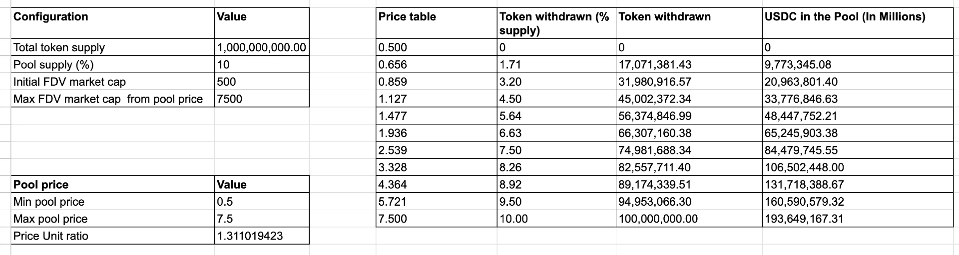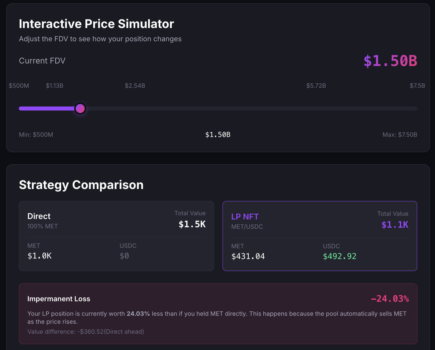 在官方公告中,Meteora 列出了不同价格位置时会被卖出的 MET 比例(最大为 10%,对应 7.5 美元的价格)。以图中最接近盘前估值的数据(1.477 美元)举个例子,即 MET 发行后 FDV 约为 14.77 亿美元,届时将有约 5.64% 的 MET 将从池中提取并被卖出。这意味着,如果你的空投份额是 100 MET,此时其中 56.4 MET 将以 48.4 USDC 的价格提前出售 —— 相较于以 1.477 美元的价格全仓抛售可获得的 147.7 美元,此时若撤出流动性,空投的 MET 价值仅剩 64.4 美元(33.6 * 1.477),再加上 USDC 的总价值约为 112.8 美元,折算后预计将出现 23.6% 的无常损失 —— 不过在实际情况下,用户参与 Liquidity Distributor 还可以分享前文提到的反狙击费用以及交易费用收益, 这里的收益与潜在损失的估测便是要不要参与 Liquidity Distributor 的核心博弈点。