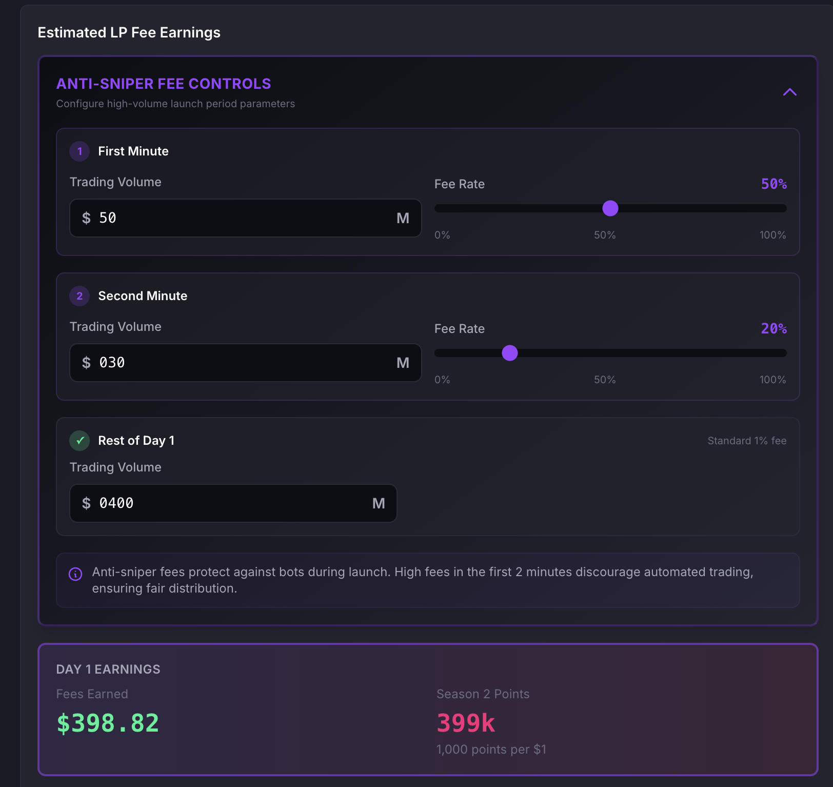 首先来看收益, 参与 Liquidity Distributor 的主要收益来源于反狙击费用(anti-sniper fee)和交易手续费用。 反狙击费用顾名思义,目的是为了缓解 MET 发行时被狙击的可能性,Meteora 对 MET 的反狙击费用设计为第一个区块开始收取 50%,之后快速衰减,预计将在 3 分钟左右降至 1%,这项收入预计是也会是首日的主要费用来源;交易费则不用过多解释了,如果没打算首日即撤出流动性并抛售 MET,该项收入将是参与 Liquidity Distributor 的持续性费用来源。