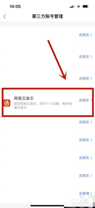 3、找到网易云音乐后点击去绑定即可。