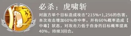 对敌方单个目标造成攻击*215%+1,256的伤害,本次攻击增加60%命中率,并有60%概率造成【中毒】状态,对攻击力低于自身的目标概率提高40%,持续3回合。