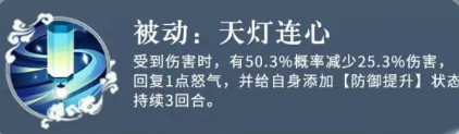 受到伤害时,有50.3%概率减少25.3%伤害,回复1点怒气,并给自身添加【防御提升】状态持续3回合。
