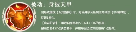 出场或施放【五龙旋舞】时,对自身以及所属主角添加【忠減护盾],持续3回合。【忠诚护盾】:吸收自身防御*70.6%+516的伤害。提高自身157点状态命中,并在每回合结束时获得1点怒气。