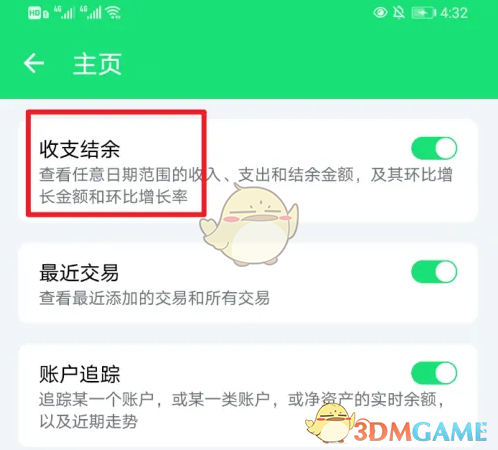3、在界面中找到“收支结余”选项开启即可。