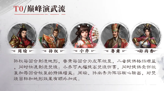 孙权每回合制造地形,鲁肃每回合为友军恢复,二者提供格挡增益同时快速制造焚烧;小乔可大幅提高焚烧伤害,同时提供受伤核复和每回合恢复的特殊增益;周瑜、孙尚香为阵容核心输出,对焚烧目标和地形效果有额外加成。