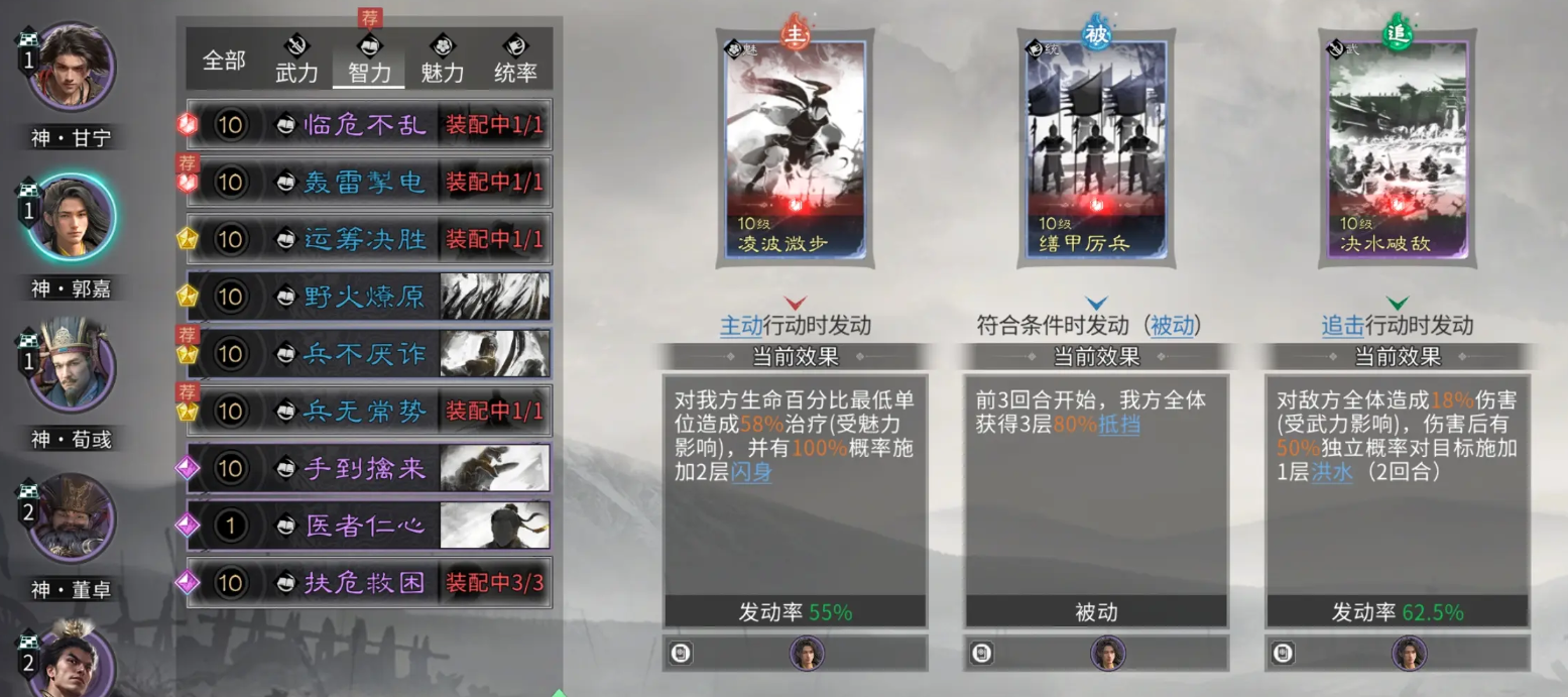 这个搭配其实是属于比较出名的一个国家队的这个阵容里面,他整体的防御能力也是比较肉的,而且加上了一定的群体攻击,在这里黄月英跟诸葛亮还有额外的羁绊加成可以提升,所以在国家队效果上面来说,绝对是很适合新手用来进行开荒的,就算没有赵云大家也可以上甘宁,这样这个阵容基本所有的玩家都有机会组成,那么后期大家如果提升自己国家队的强力,还有一个搭配就是荀彧加上郭嘉加上许褚。