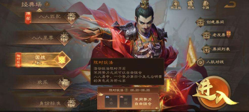 2、国战模式:魏蜀吴群,双将配合,为国而战;