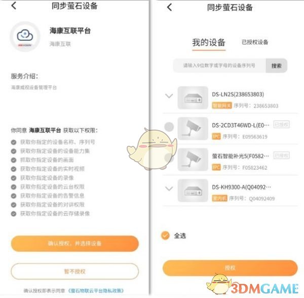 在APP首页点击“萤石账号同步”,同意海康互联平台获取萤石账号信息及相关权限,选择授权的设备即可完成同步。