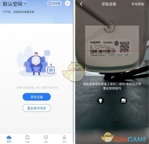 海康互联app支持通过扫描二维码/条形码添加设备。
