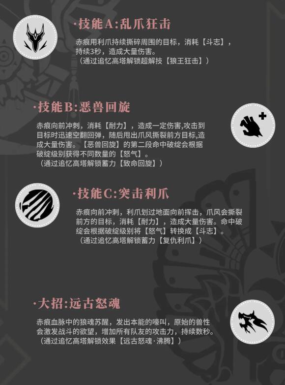 雪原猎人的普通攻击会连续对眼前的目标撕裂5次,每一次的命中都可以为自身增加怒气值,如果敌人的韧性条已经完全空掉,此时雪原猎人对目标发动的攻击还能够额外的恢复自身的体力。长按普攻能够将撕裂改变成狼王爪,使用狼王爪攻击目标,会让敌人的身上出现狼魂的残影。当敌人身上的残影被叠加到一定数量时,雪原猎人就可以在敌人身后召唤出狼人,狼人持续一段时间会自动对身边的目标发起攻击。