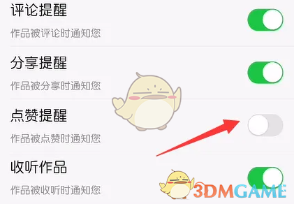 4、最后,点击关闭“点赞提醒”滑块开关。