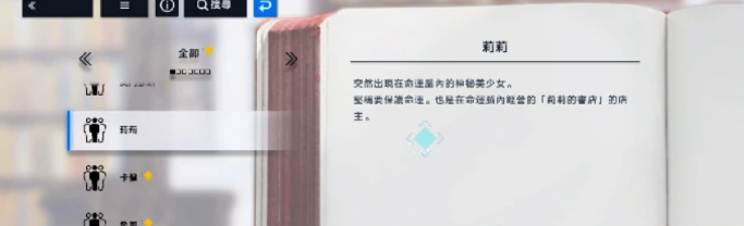 她更像游戏当中的主要引导角色,也就是大家的向导,可以让大家通过莉莉的引导来体验各类剧情以及找到自身的养成任务,从背景设定来看,莉莉其实是突然出现的一个角色,她出现的效果就是为了守护命运,所以在整体的身份上面也是比较神秘的,同时,作为书店的经营者,她出现的概率非常高,所以赢得大家好感度还是非常容易的,在外观设定上面,学院风制服看起来也是具有少女气息的,外观上面还有一个工作证,是代表了她书店店主的身份,同时手里经常拿着一本书,所以看起来整体的气质是比较具有亲和力的。