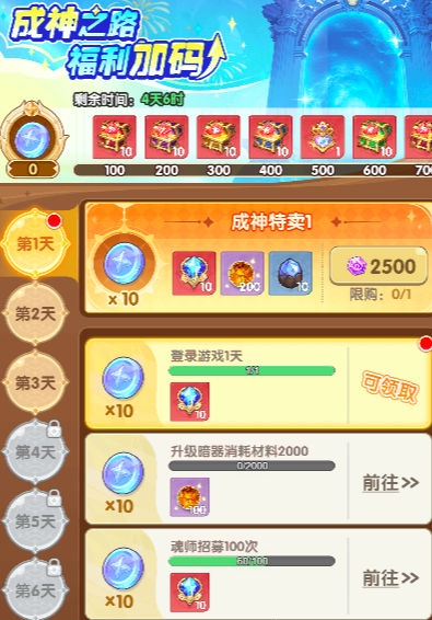 第二个技巧可以将许愿池和秘宝奖励结合使用,玩家在许愿池中尽量先锁定自己想要的目标魂师,然后再开启抽卡模式,利用秘宝当中的蓝翡晶石会大大提高获得理想魂师的概率,而且建议新手玩家也参与成神之路,尽量完成资源的囤积,连续签到8天,就可以开启成神之路这个活动了。