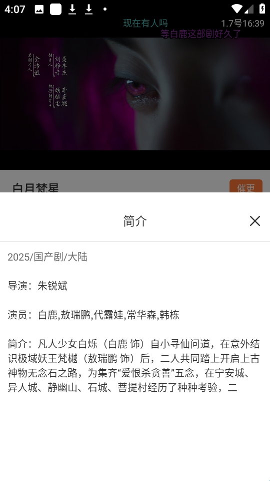 香葱追剧app剧集怎么选择,下载安装好最新版的香葱追剧,打开应用,接着任意选择一部你喜欢的电视剧,这里以“白月梵星”为例,播放界面,可以直接查看这部剧集的全部选集内容。