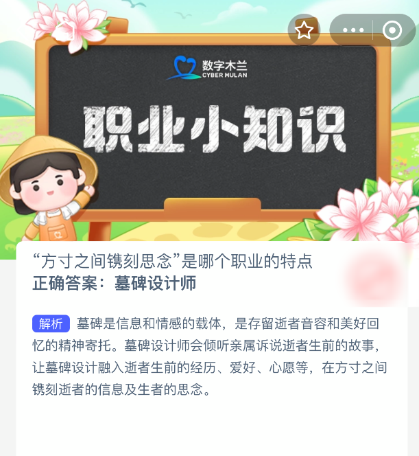 “方寸之间镌刻思念”是哪个职业的特点?【蚂蚁新村每日一题】2025年10月28日题目已发布!坚持答题,积累木兰币,即可加速小镇建设。答对本题,立即可享“产速+3/时”的加速奖励!今天正确答案是【墓碑设计师】。墓碑设计师会倾听亲属诉说逝者生前的故事,让墓碑设计融入逝者生前的经历、爱好、心愿等,在方寸之间镌刻逝者的信息及生者的思念。