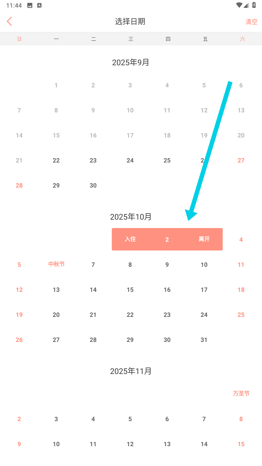 1、我们可以在【选择日期】界面,挑选好入住和离开的日期,这样才能继续后续预订流程。