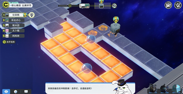 4、第二阶段观察地图,找到对应的特性优势的猫猫糕,比较一下当前的距离,如果大幅度领先就仍选择第一个猫猫糕,如果没有,就选择对应特性优势的猫猫糕。比如第一阶段是捣乱专家领先,第二阶段却全是减速,此时如果太卜糍离得很远就仍选捣乱专家,否则就太卜糍。第二阶段注意要开始看情况使用道具了。