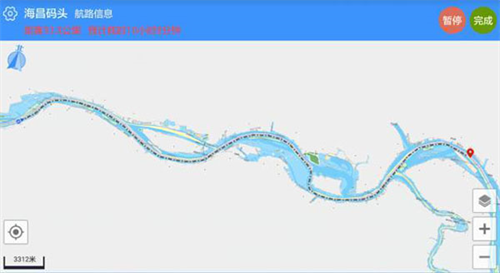 2、点击查询到的结果后,便可直接定位到海昌码头在图中的实际位置,并显示出海昌码头和你船舶直接的距离和预计航行耗时。再点击去这里,便规划出你船舶实际位置到海昌码头的航线。