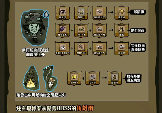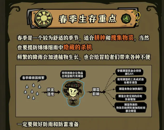 春季是一个较为舒适的季节,适合耕种和搜集物资,当然也要提防绵绵细雨中隐藏的杀机频繁的降雨会加速植物生长,也会给玩家带来各种不便。