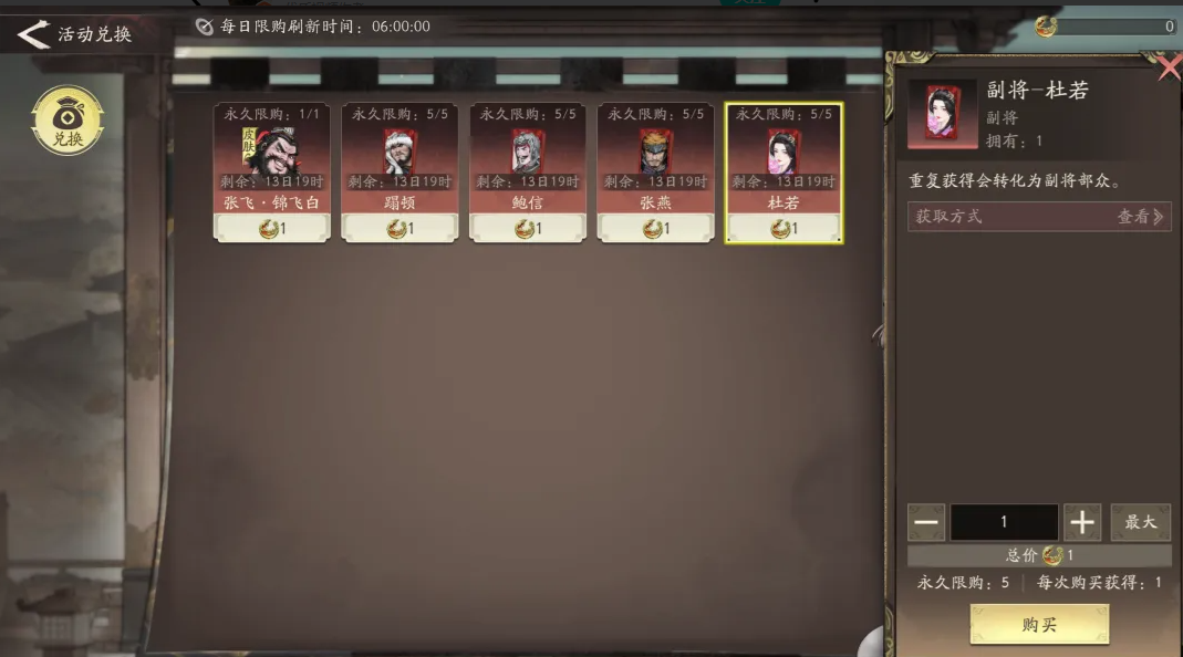 该活动商店的鲍信、张燕、杜若均可在副将寻访中正常招募、刷片,兑换这3个性价比不高。