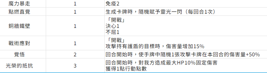 强化类的卡牌,虽然说数量并不是很多,可是从根本上就能有效提升战斗力。铜墙铁壁在开战阶段就可以获得不屈以及决心buff,可以增强队伍的续航能力。战术应对主要是针对那些带护盾的敌人,可以额外的增加15%的伤害。让输出更有针对性,另外还有觉悟,每一个回合全部都可以随机强化一张攻击卡,有50%的伤害加成,在长期积累之后自然就会有惊人的效果。适合于极限输出阵容,然后去追求爆发性的伤害,所以掌握这一些也是比较关键的。