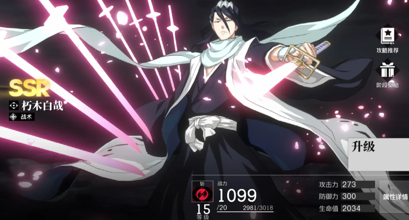 朽木白哉是游戏当中SSR级别的强攻型角色,主要技能附带有穿透敌方防御的效果,在使用了大招期间,可以提升自身技术攻击倍率的400%,在游戏内,可以进行推图和清场,于PVE内,是最强的一个输出单位。