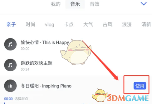 4、在音频列表中点击“使用”按钮即可添加背景音乐。