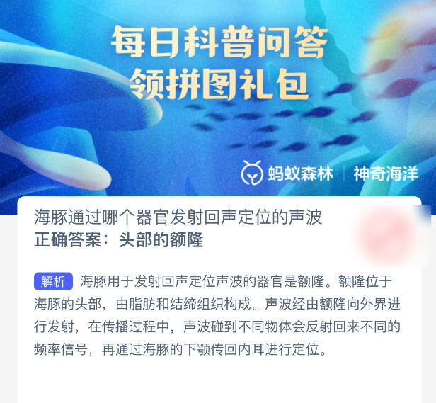 以上就是海豚通过哪个器官发射回声定位的声波?神奇海洋今天答案最新2025年11月16日分享,更多相关攻略内容,请点击关注0405手游网更新!