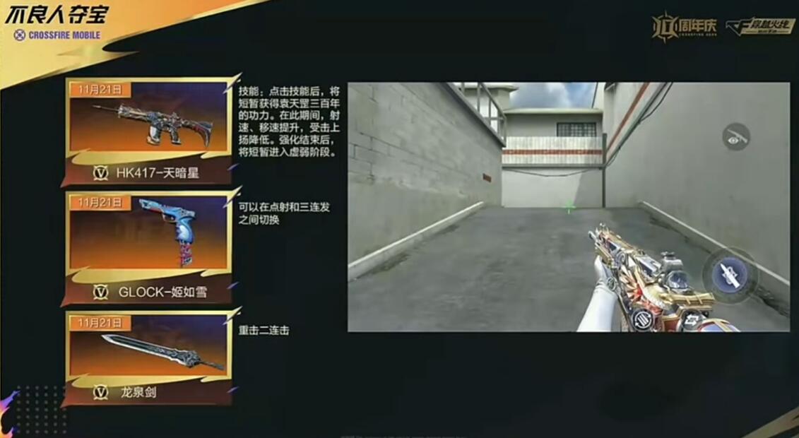 其实在这次夺宝活动当中,玩家发现了三款专属的联动武器,这三款武器实力各不相同,比如主武器是HK417天暗星,它作为自动步枪,综合性能,可以直接将其跟朱雀进行比较,不过这个朱雀版本是升级版本,要说这个武器能够有效的提高生射击速度,并且在移动速度方面也会有所提高。姬如雪在设计的时候是以格洛克作为基础条件,当然它也融入了角色主题元素,要说该武器能够实现三连发,也是英雄级手枪。龙泉剑的攻击速度是中等水平,但是它的整体表现力是比较均衡的,可以运用在近距离作战当中。