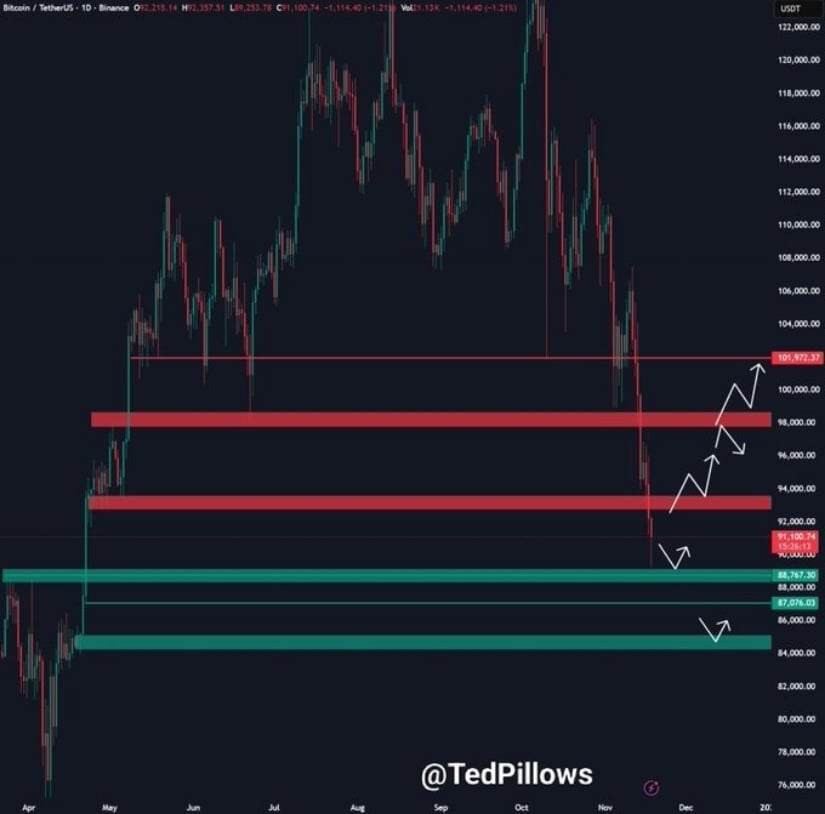 比特币回补CME缺口后跌破9万美元,88,000-90,000美元区间或成局部底部。来源:@TedPillows via X