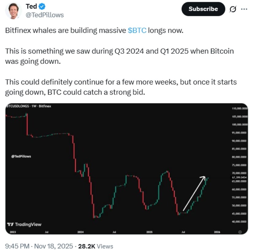 Bitfinex巨鲸大举建立BTC多头头寸,或为当前回调提供强劲支撑。来源:@TedPillows via X