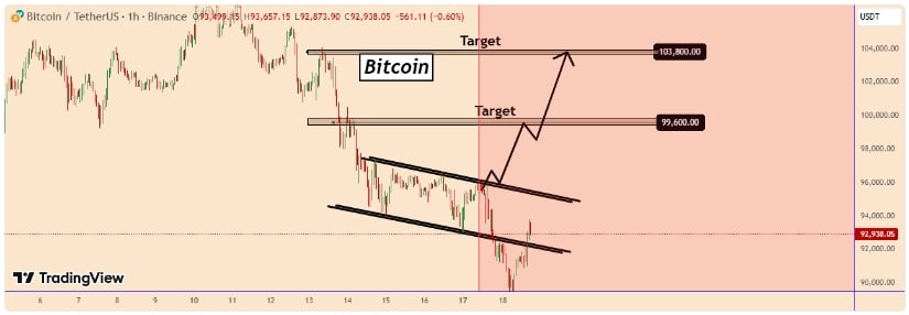 比特币显现短期看涨反转信号,若突破通道上轨,目标位看99,600-103,800美元。来源:TradingView@KlejdiCuni