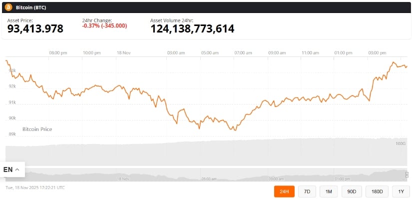 截至发稿,比特币报93,423美元,24小时下跌0.37%。来源:Brave New Coin比特币价格指数