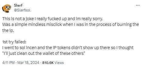 Slerf (SLERF) 是Solana区块链上以树懒为主题的meme代币,由匿名开发者@slerfsol创建。该项目在2024年3月预售期间因意外烧毁价值1000万美元的流动性SOL和预售代币而闻名,却意外成为加密社区传奇。