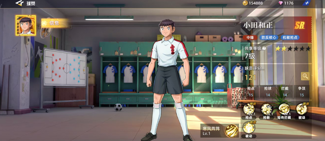 作为初始可获得的SR级球员之一,小田和正拥有清晰的场上定位——中锋。他的技能体系特别适合防反打法,机动性强,反应灵敏。基础评分为121,在同品质球员中处于中等偏上水平。其关键属性如抢点15、抢球14、拦截14、争顶15,体现出他在空中对抗和防守落点方面的优势。六维图中抢球数值相对偏低,仅为14,因此在实战中应尽量规避直接拼抢,转而发挥他在其他维度的均衡能力。