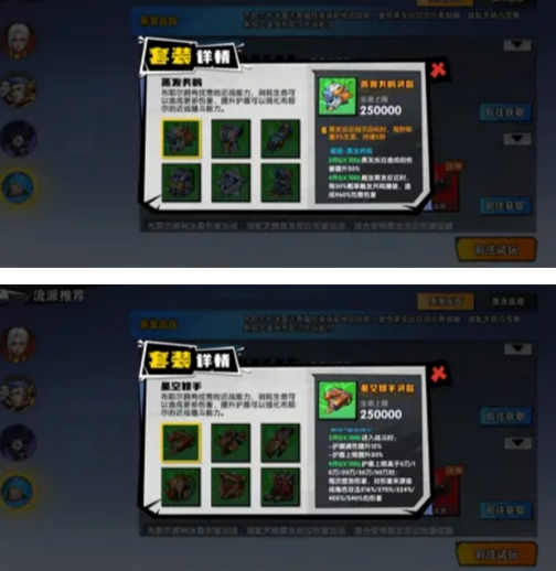 分别为两套,蒸发套,星空套,推荐搭配:竞技套:蒸发护手,蒸发心核,星空头盔,星空衣服,星空背包,星空鞋子(肉套,高额的护盾,护盾恢复,护盾减伤,同战力可直接反伤反死)副本套:蒸发衣服,蒸发护手,蒸发心核,蒸发鞋子,星空头盔,星空背包