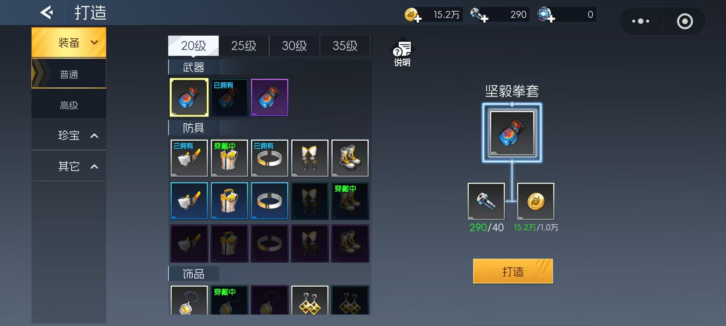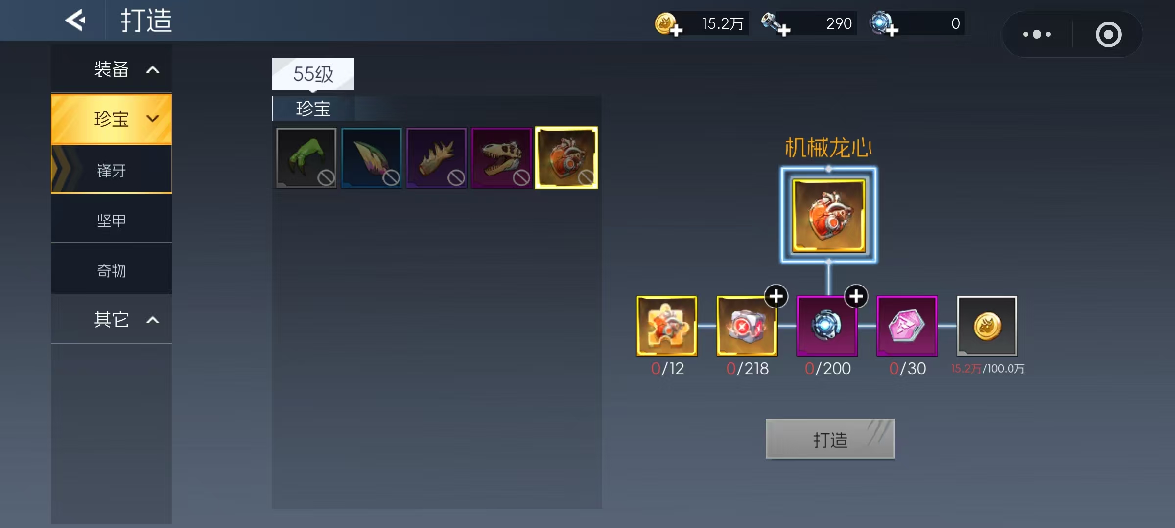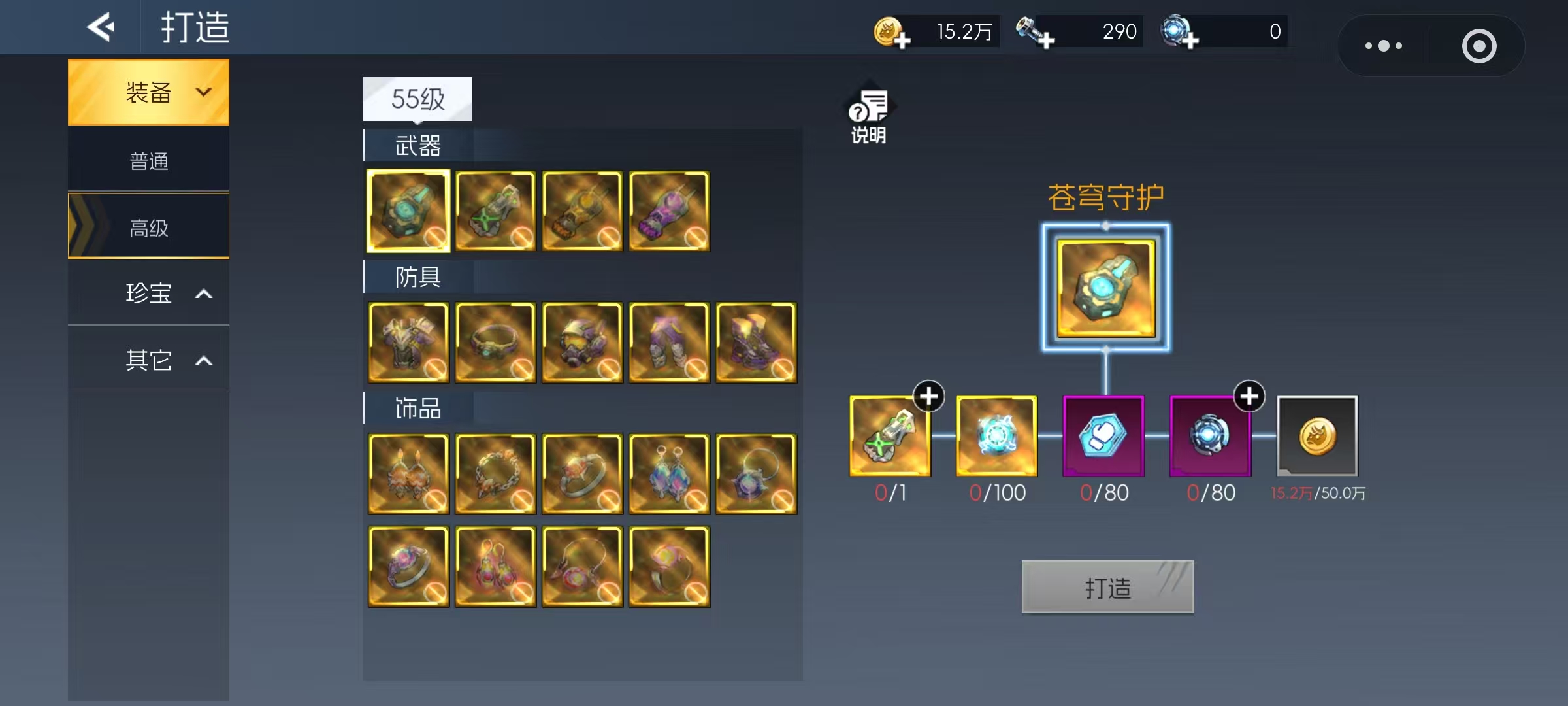 解锁打造功能后,玩家可点击游戏界面右下角的“变强”入口,进入相关页面。请注意,打造与改造为两个独立模块,操作时需注意区分。打造主要分为三大类别:装备、珍宝以及其他材料类。首先来看装备打造,包括武器、防具和饰品的制作。普通打造仅需常规资源即可完成,而远古级别的打造则需要稀有素材支撑。例如,龙之巢穴掉落的天空之源、始源龙骸,以及遗迹宝库产出的精粹钢,都是打造高阶装备不可或缺的核心材料。
