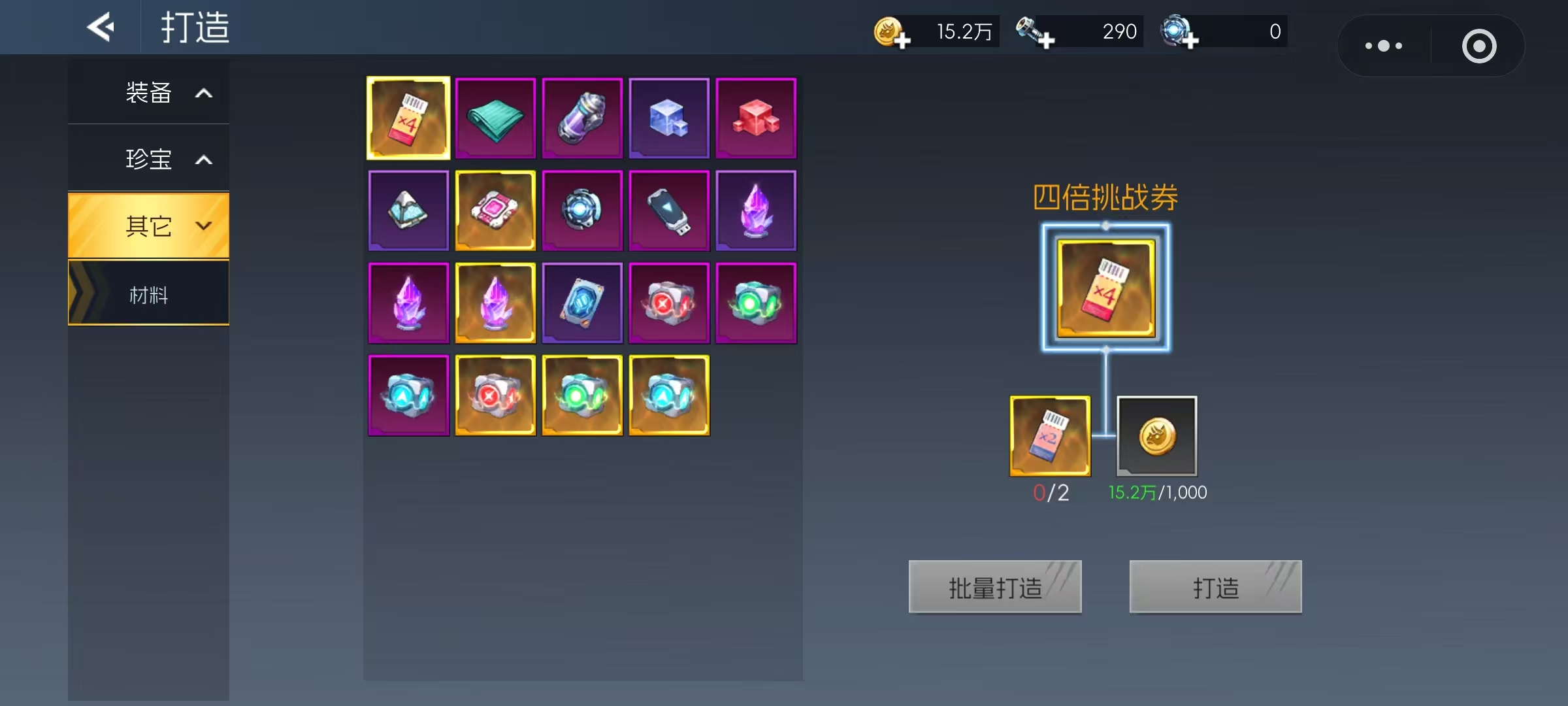 珍宝打造包含锋牙、肩甲与奇物三种类型,每种对应不同战斗增益效果。打造所需材料多来源于逃生之路等限时副本,获取后需进行洗炼以获得理想特性,从而显著增强挑战BOSS时的输出与生存能力,是后期战力突破的重要组成部分。最后是其他类打造,主要涉及功能性材料的合成,如四倍挑战券(由两张双倍挑战券加金币合成)、高级强化纤维(强化纤维+金币)、强化保护剂及高级变换物质等。这些高阶辅材在装备升级过程中起到关键作用。