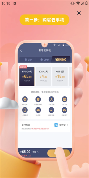 1、首先需要打开软件进入主页,在云手机界面可以看见购买游戏、充值会员。