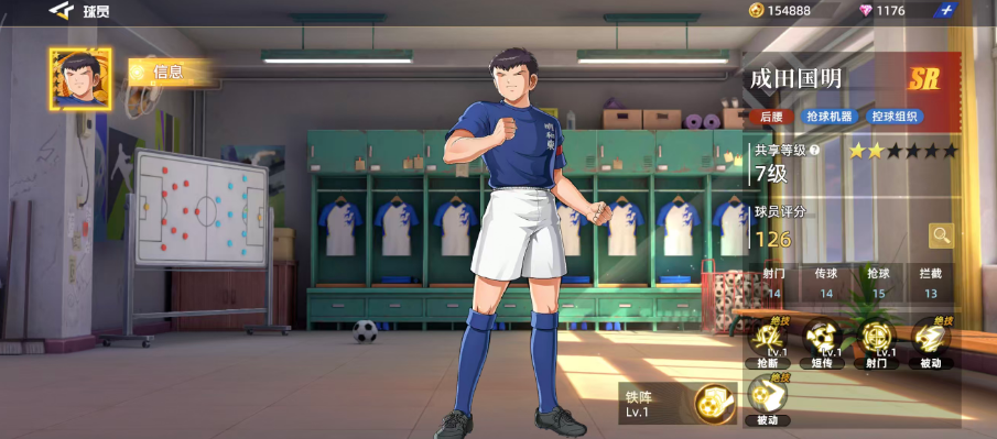 游戏当中成田国明作为SR角色的话,一般放在后腰位置上面使用能够带来的角色更突出,而且效果上面还可以当做抢球的优势角色来进行使用,这个球员目前他自身的总体评分达到了126的效果,所以在他的六维图上面,大家可以看到各项属性都比较平均的一个数值体现,初期如果要用他的优势技能的话,这里大家可以选择的是射门、传球、抢球、拦截四项属性效果,其中比较出色的就是抢球的属性,得分达到了15点的比分,而射门跟传球的评分效果目前是有14分,拦截的效果上面只有13分,根据目前的综合评价来说,他的各项属性还是算作比较平均的。