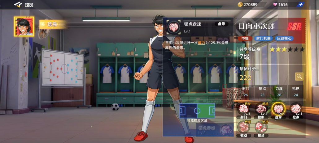另外他在抢点效果上面有一个猛虎头槌的技能,使用的话带来的也是基础效率的一个抢点效果,这里达到125.3%的强点之后,因为是用放区域比较小,所以可能这个强点的效果用处比较少,大家可以关注一下他后期的两个被动,目前在第一个被动绝技恶虎獠牙当中,日向小次郎带来的是射门属性的增加,这里增加了3.5%的属性数值,之后他使用猛虎射门还会增加自己2.7%的爆发效果,如果对面自身门将他在体力数值上面是低于自身一半的数值时,日向小次郎他还会根据射门动作来额外增加8.9%的爆发效果,所以有这个技能在的时候他射门成功率是超级高的。