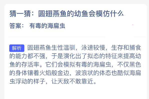 以上就是猜一猜:圆翅燕鱼的幼鱼会模仿什么?神奇海洋今天答案最新2025年11月30日分享,更多相关攻略内容,请点击关注0405手游网更新!