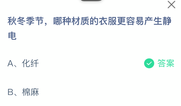以上就是秋冬季节,哪种材质的衣服更容易产生静电,支付宝蚂蚁庄园2025年12月3日答案最新,更多精彩内容,请点击关注0405手游网更新!