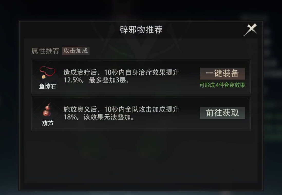 不同的辟邪物效果也不同,当人们搭配单间时只能令角色享受到辟邪物本身所带来的属性加成,搭配两件以上时,辟邪物会生效对应的两件套效果,四件时则会生效四件套效果。不同辟邪物在混搭时,只要所装备的数量满足两件或四件,都能生效对应的效果,再加上每位角色最多能搭配六件辟邪物,所以各位可使用“4+2”或“2+2+2”的搭配方案,尽量确保角色能吃到套装属性加成,除非自己手上没有成套的辟邪物,否则最好别用散件来混搭。