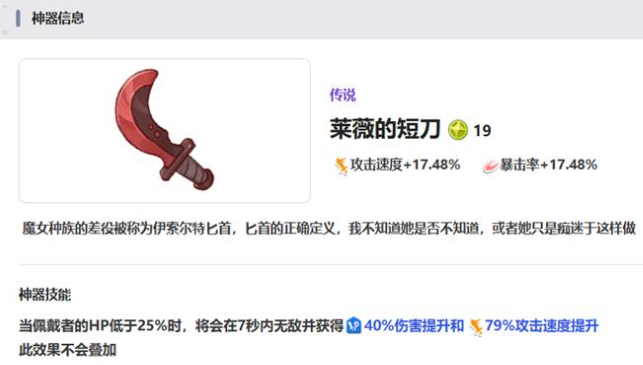喜欢高风险的玩家可以关注莱威的短刀。有17.48%的攻击速度,还有暴击率,这一种加成还是很亮眼的。角色的生命值如果低于25%就会触发7秒的无敌状态,同时可以获得79%攻速加成,还有40%伤害提升。持续输出型角色会比较适合装备天气晴朗卡,会有17.98%的攻击速度,还有暴击率加成。每三次普通攻击之后,还会有闪电追加打击,可以造成150%的攻击力额外伤害。