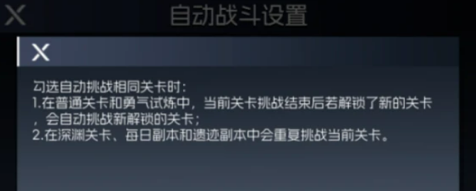 这里还有一个选项叫“复活币不足退出”,若是你勾了这个选项,那么角色死亡之后,如果复活币用完,系统就会直接退出副本了,还不用你自己手动退出。再介绍多一个很实用的功能,也就是“自动挑战相同关卡”,这个就能让你在深渊、每日副本和遗迹副本里面反复进行挑战,要是普通的关卡或者是勇气试炼,系统也会帮得上忙。所以如果你是想要反复刷的玩家,这个功能肯定是不能错过的。