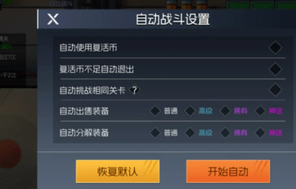 这里面有一个选项就是让你自动使用复活币了。要是你的角色在战斗中死了的话,系统就会自动使用复活币来复活,一直到复活币用完,或者是副本通了关为止。这个功能就比较适合那些不想要老是看着屏幕的玩家们,死了以后也可以直接复活,手动操作根本不需要,省去很多的麻烦。